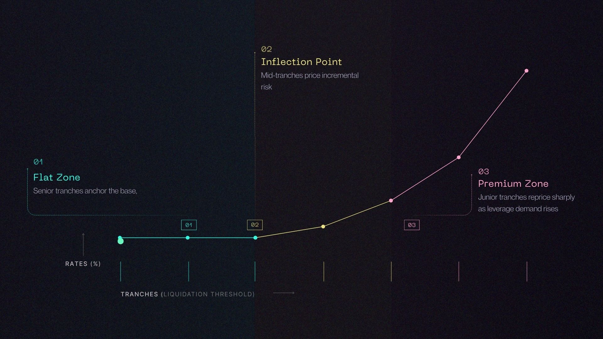 If an individual borrower has a higher opportunity cost than the market’s internal opportunity cost, they will prefer to borrow from the most junior tranches as that would give them the lowest all-in cost. Alternatively, borrowers with a lower opportunity cost will prefer to borrow from more senior tranches as this minimizes their all-in cost. The competing forces allow Lotus markets to adapt to the borrower preferences. At the same time, lenders – and their risk appetite – determine which tranches they are willing to supply to. The market prices all of this information and creates an adaptive risk curve.